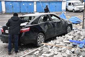 Политическая обстановка в ДНР после проведения специальной военной операции Вооруженных Сил (ВС) России на Украине. Виды Донецка. Жанровая фотография. Последствия обстрела в автохозяйстве Областного Совета Профсоюзов в переулке "9 января".
