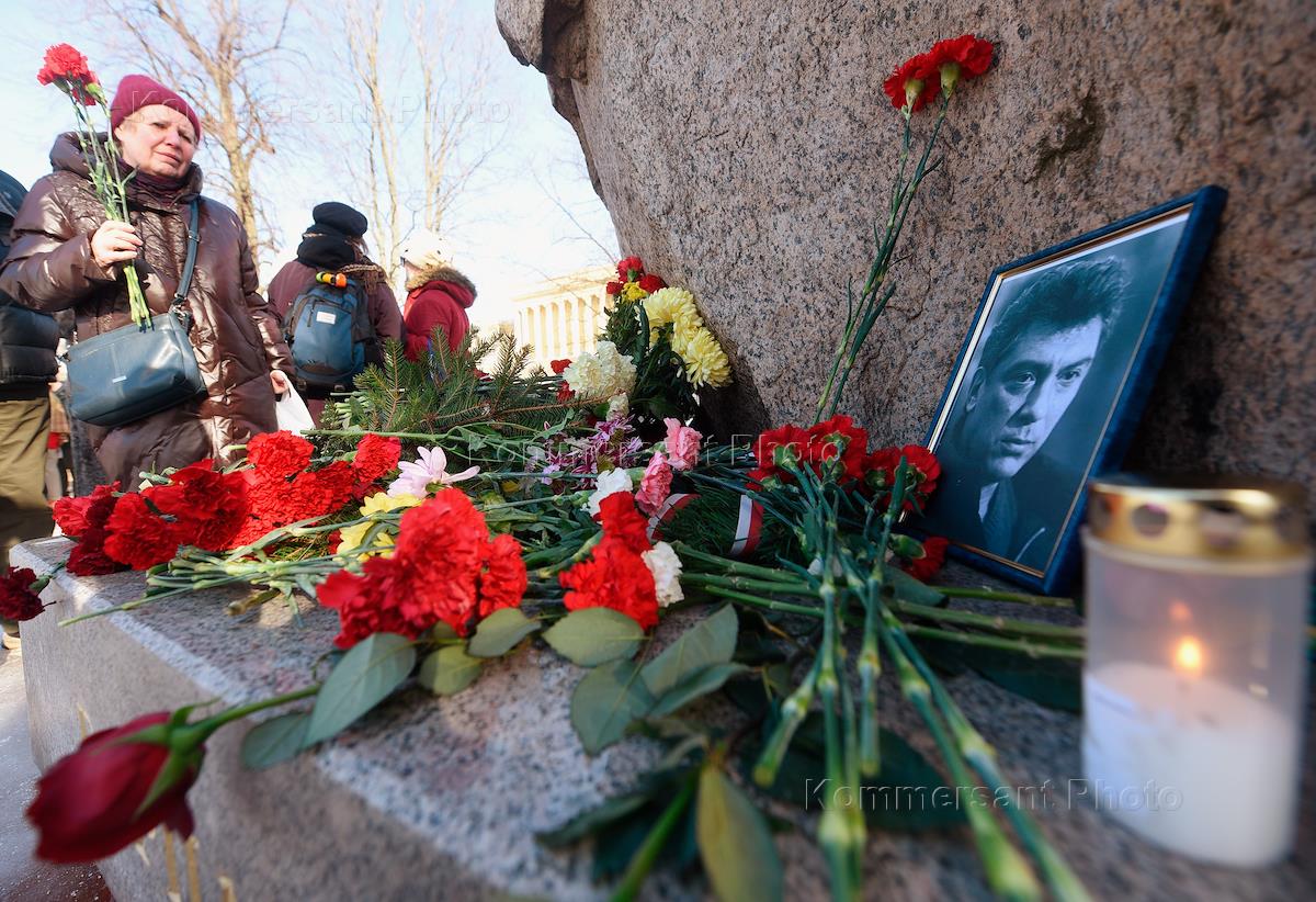 Акция памяти политика Бориса Немцова у Соловецкого камня на Троицкой площади Петроградской стороны.