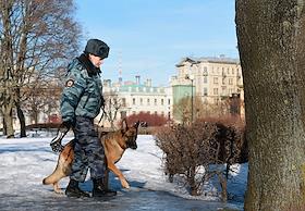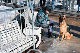 Акция памяти политика Бориса Немцова у Соловецкого камня на Троицкой площади Петроградской стороны. Сотрудница полиции со служебной собакой на месте проведения акции.