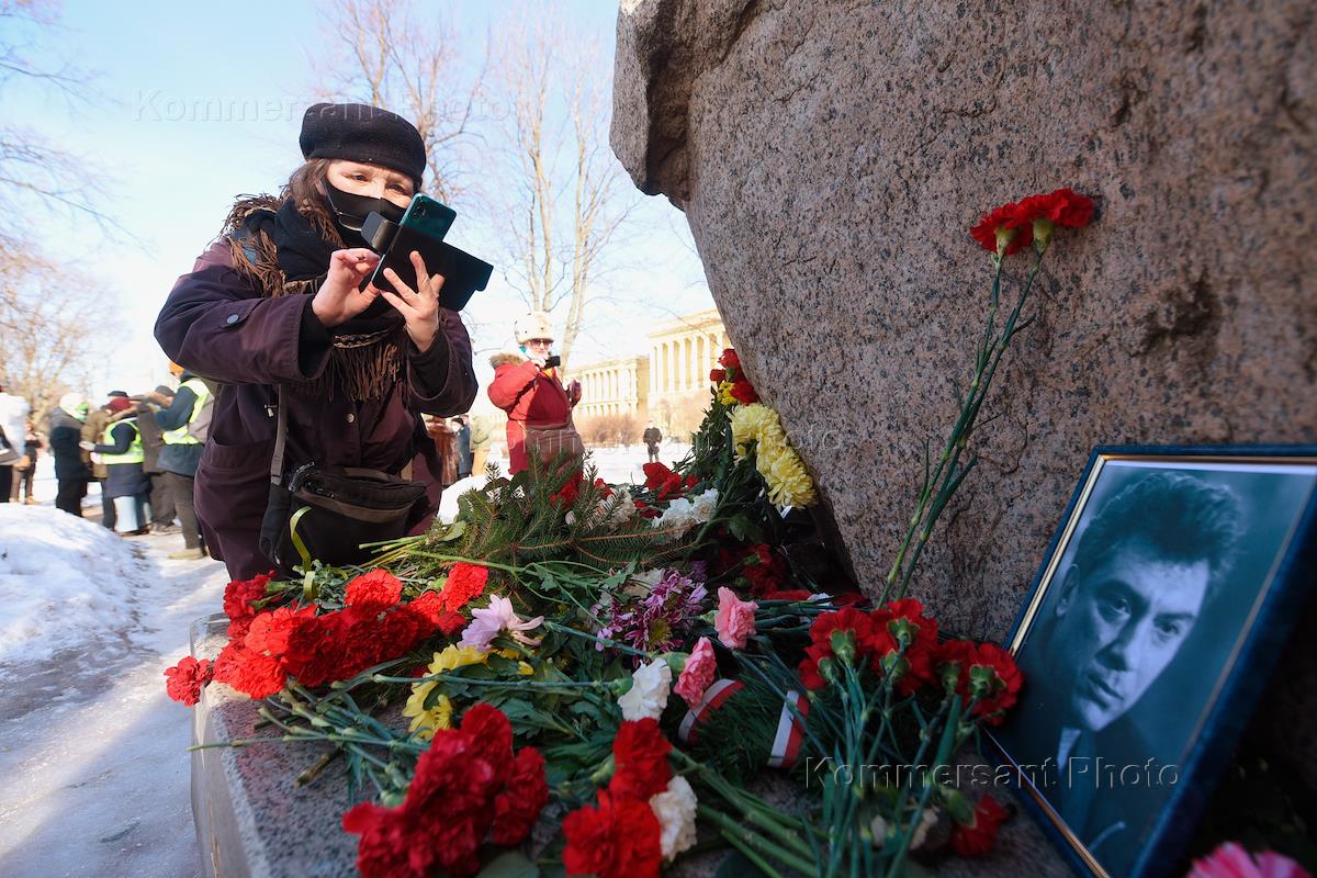 Акция памяти политика Бориса Немцова у Соловецкого камня на Троицкой площади Петроградской стороны.