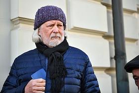 Рассмотрение апелляционной жалобы на решение о ликвидации о ликвидации международной общественной организацией "Международное историко-просветительское, благотворительное и правозащитное общество "Мемориал" (внесен Министерством юстиции России в реестр некоммерческих организаций, выполняющих функции иностранного агента) в Верховном Суде России. Председатель совета ПЦ "Мемориал" Александр Черкасов перед зданием суда.