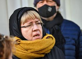 Рассмотрение апелляционной жалобы на решение о ликвидации о ликвидации международной общественной организацией "Международное историко-просветительское, благотворительное и правозащитное общество "Мемориал" (внесен Министерством юстиции России в реестр некоммерческих организаций, выполняющих функции иностранного агента) в Верховном Суде России. Исполнительный директор, член правления Международного общества "Мемориал" Елена Жемкова перед здание суда.