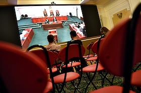 Рассмотрение апелляционной жалобы на решение о ликвидации о ликвидации международной общественной организацией "Международное историко-просветительское, благотворительное и правозащитное общество "Мемориал" (внесен Министерством юстиции России в реестр некоммерческих организаций, выполняющих функции иностранного агента) в Верховном Суде России. Журналисты смотрят заседания по телевизору в здании суда.