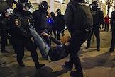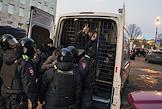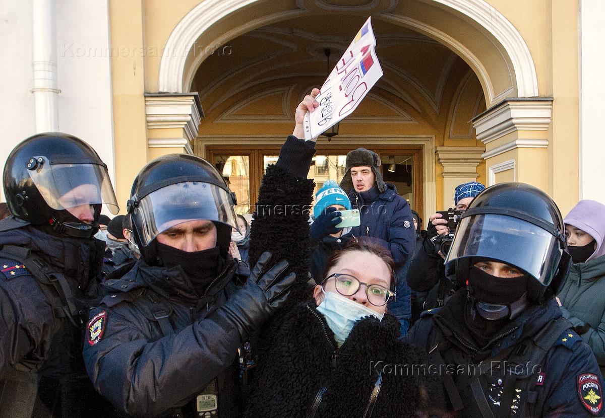 Несогласованная акция против специальной военной операции на Украине на Невском проспекте у Гостиного двора. 24 февраля президент России Владимир Путин объявил о начале военной спецоперации в ответ на обращение глав Донецкой Народной Республики (ДНР) и Луганской Народной республики (ЛНР) об оказании военной помощи. Сотрудники полиции во время задержания участников акции.