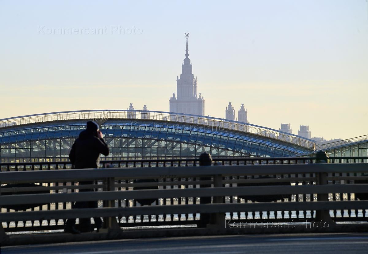 Views of Moscow. Bridge of Bohdan Khmelnitsky across the Moskva River and the main building of the Lomonosov Moscow State University (MSU) on Vorobyovy Hills.