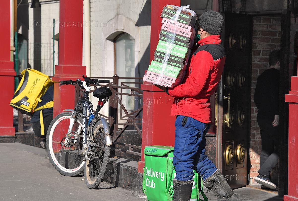Жанровая фотография. Курьер службы доставки еды Delivery Club ("Деливери Клаб") несет коробки с пиццей на улице.