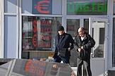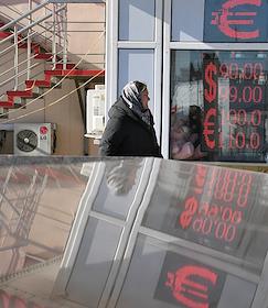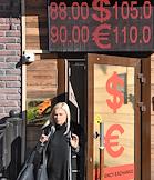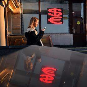Жанровая фотография. Пожилая женщина проходит мимо пункта обмена валюты.