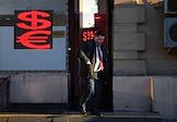 Жанровая фотография. Мужчина выходит из пункта обмена валюты.