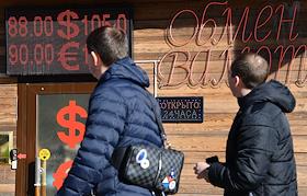 Жанровая фотография. Электронное табло на улице пункта обмена валюты с курсом доллара и евро.