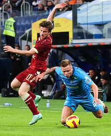 Российская Премьер-Лига (РПЛ). Тинькофф - Чемпионат России по футболу 2021/2022. 19-й тур. Матч между командами "Зенит" (Санкт-Петербург) - "Рубин" (Казань) на стадионе "Газпром Арена" (Санкт-Петербург). Игрок команды "Зенит" Даниил круговой, (справа) и игрок команды "Рубин" Андерс Дрейер (слева) во время матча.