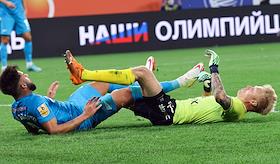 Премьер-Лига (РПЛ). Тинькофф - Чемпионат России по футболу 2021/2022. 19-й тур. Матч между командами "Зенит" (Санкт-Петербург) - "Рубин" (Казань) на стадионе "Газпром Арена" (Санкт-Петербург). Вратарь команды "Рубин" Юрий Дюпин (справа) во время матча.