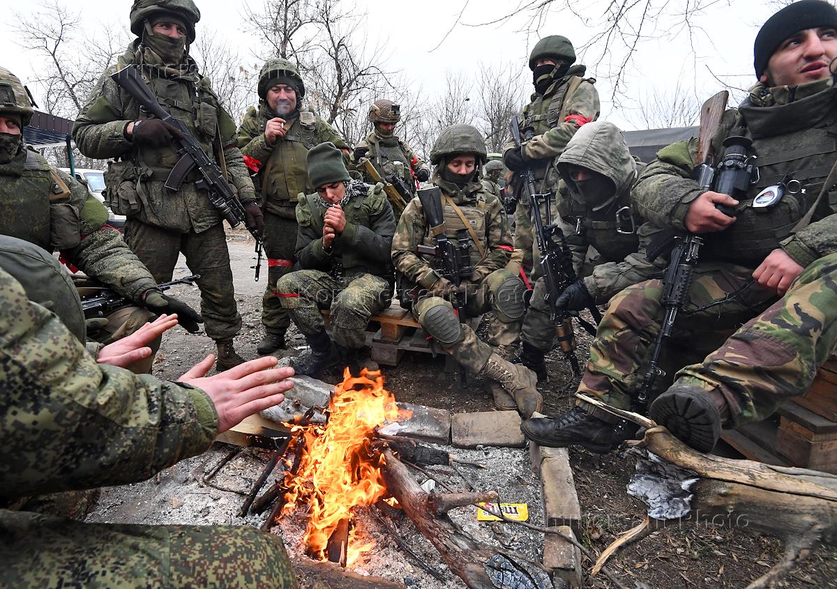 Политическая обстановка в ДНР в период проведения специальной военной операции Вооруженных Сил России на Украине. Военные отдыхают у костра во время операции в Волновахском районе.