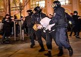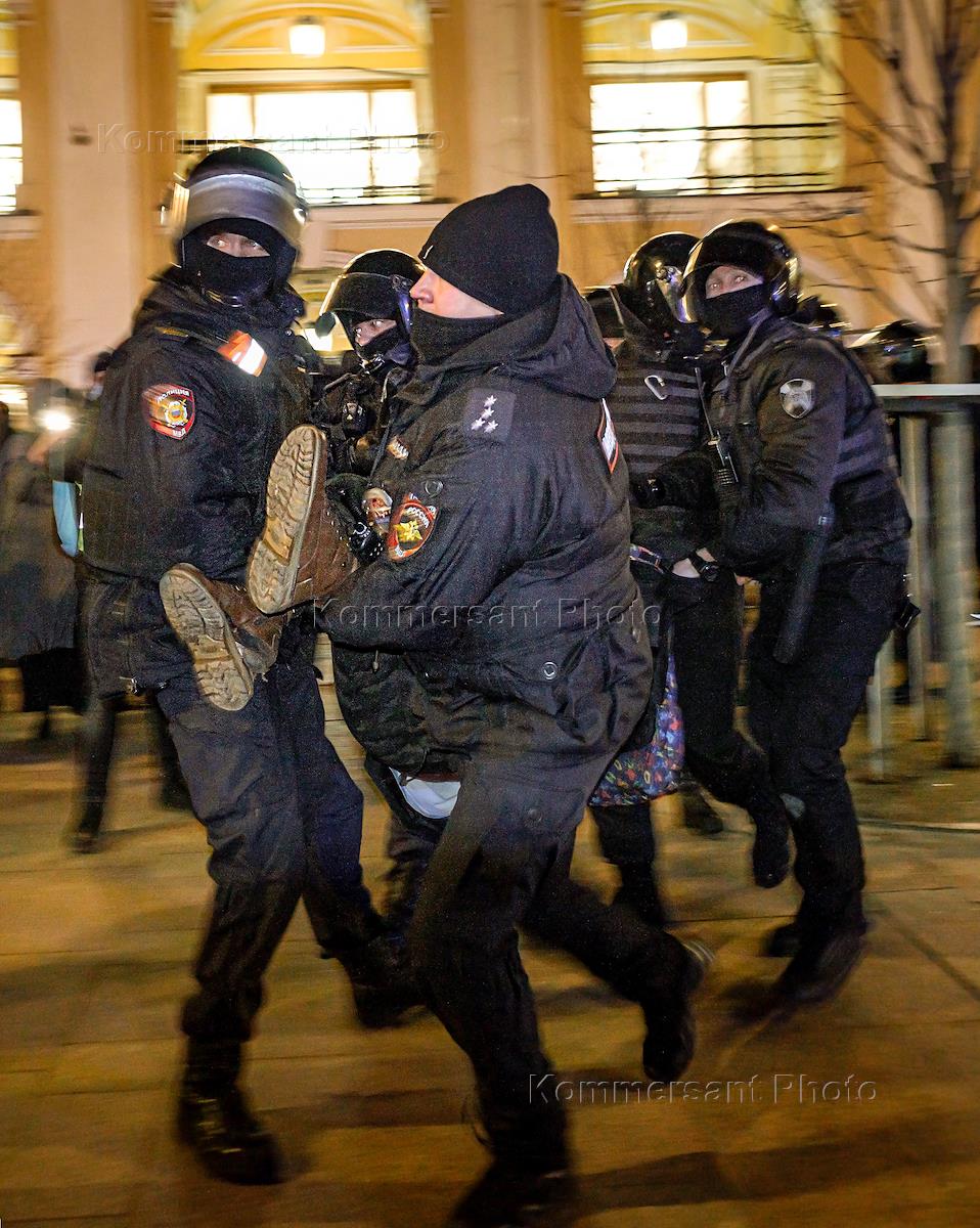 Несогласованная акция протеста против специальной военной операции Вооруженных Сил России на Украине на Невском проспекте у Гостиного двора. Сотрудники полиции во время задержания участников акции.