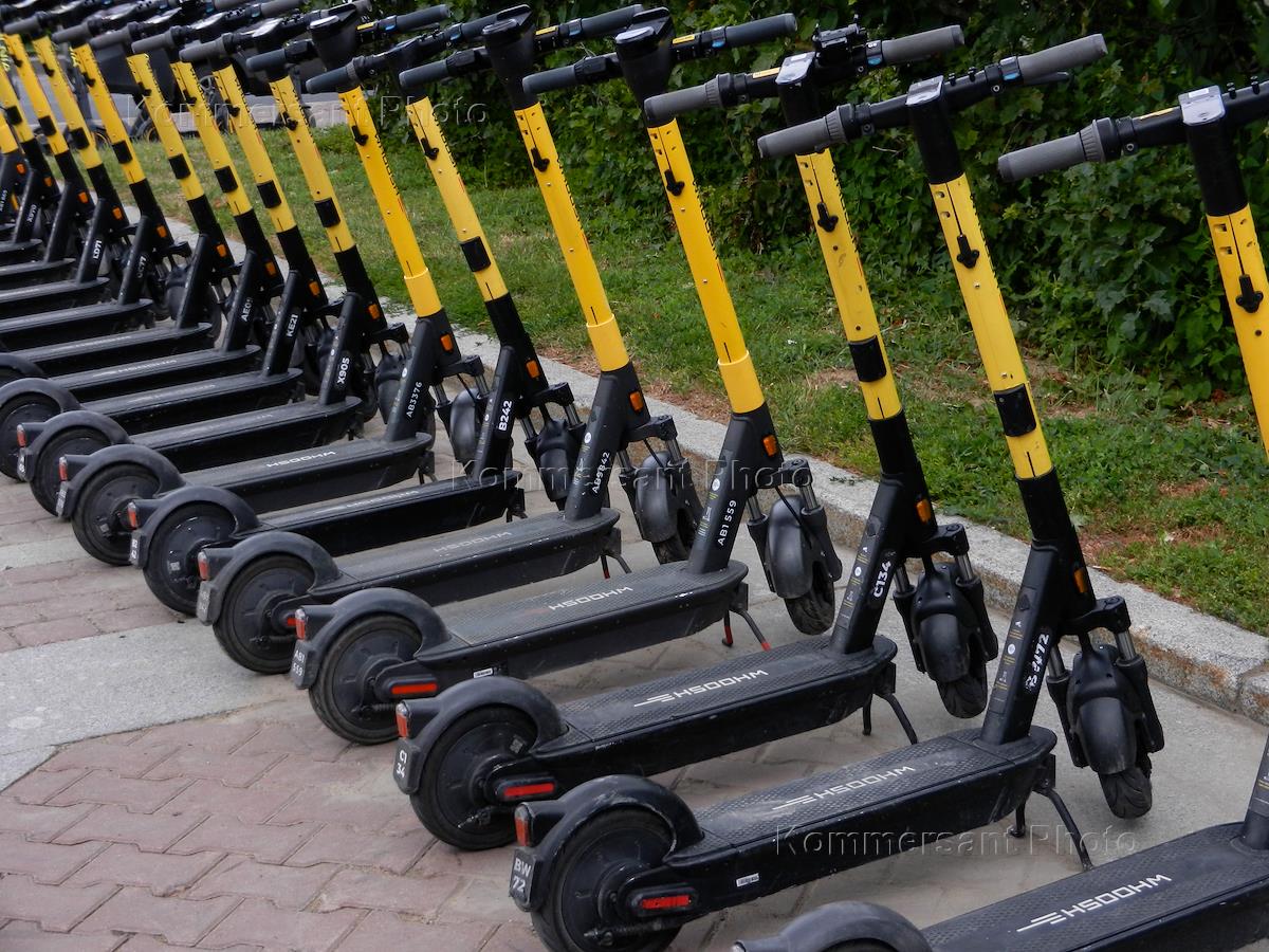 Жанровая фотография. Стоянка проката электросамокатов на улице города.