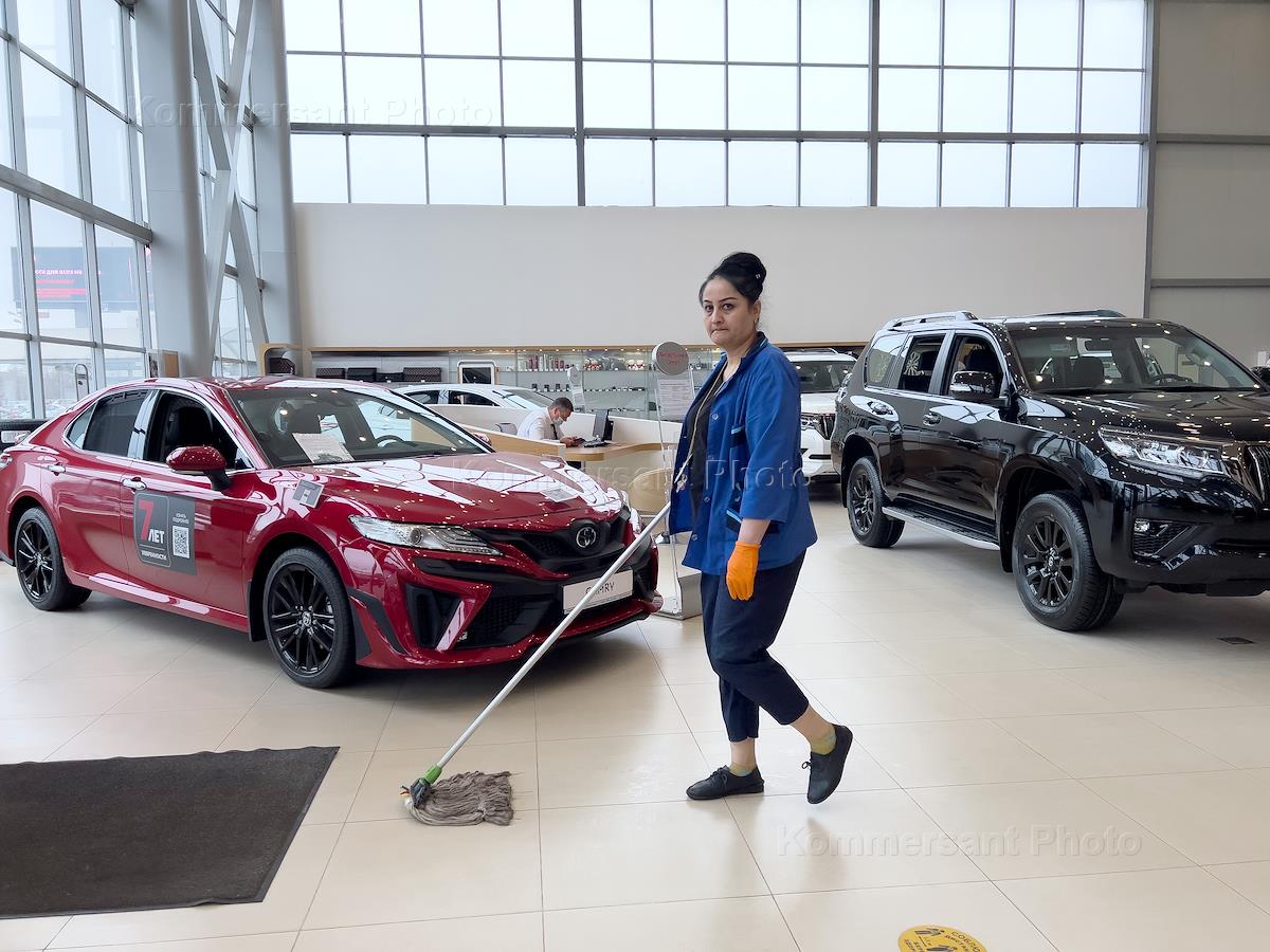 Жанровая фотография. Уборщица во время влажной уборки автосалона "Тойота Центр Шереметьево" .