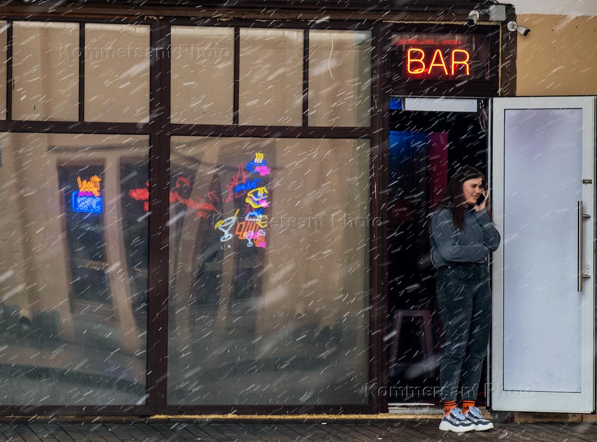 Жанровая фотография. Девушка стоит у входа в бар во время циклона "Мирелла".
