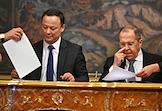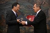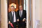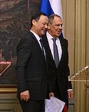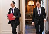 Министр иностранных дел России Сергей Лавров (справа) и министр иностранных дел Киргизской Республики Руслан Казакбаев (слева) перед началом переговоров в Доме приемов МИД России.