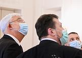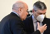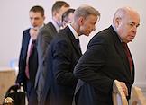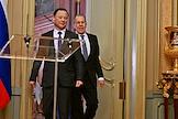 Переговоры министра иностранных дел России Сергея Лаврова и министра иностранных дел Киргизской Республики Руслана Казакбаева в Доме приемов МИД России. Специальный представитель президента России по международному культурному сотрудничеству Михаил Швыдкой (слева) и заместитель министра иностранных дел России Андрей Руденко (справа) перед началом переговоров.