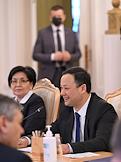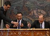 Переговоры министра иностранных дел России Сергея Лаврова и министра иностранных дел Киргизской Республики Руслана Казакбаева в Доме приемов МИД России. Министр иностранных дел России Сергей Лавров (справа) и министр иностранных дел Киргизской Республики Руслан Казакбаев (в центре) во время подписания программы сотрудничества между МИД России и МИД Киргизии на 2022-2024 годы.