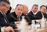 Переговоры министра иностранных дел России Сергея Лаврова и министра иностранных дел Киргизской Республики Руслана Казакбаева в Доме приемов МИД России. Министр Иностранных дел России Сергей Лавров (в центре) во время переговоров.