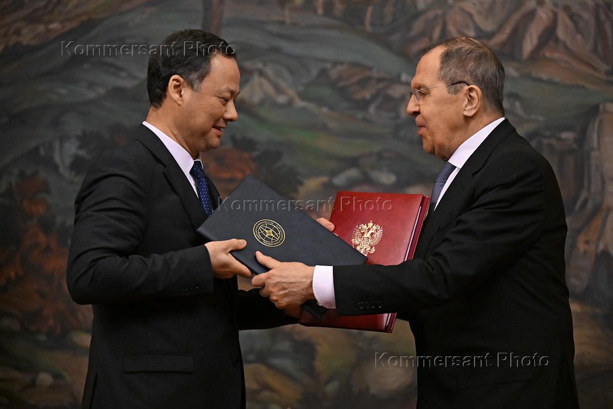 Переговоры министра иностранных дел России Сергея Лаврова и министра иностранных дел Киргизской Республики Руслана Казакбаева в Доме приемов МИД России. Министр иностранных дел России Сергей Лавров (справа) и министр иностранных дел Киргизской Республики Руслан Казакбаев (слева) во время подписания программы сотрудничества между МИД России и МИД Киргизии на 2022-2024 годы.