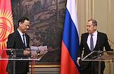 Переговоры министра иностранных дел РоссииСергея Лаврова и министра иностранных дел Киргизской Республики Руслана Казакбаева в Доме приемов МИД России. Министр иностранных дел России Сергей Лавров (справа) и министр иностранных дел Киргизской Республики Руслан Казакбаев (слева) во время пресс-конференции по итогам переговоров.