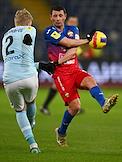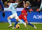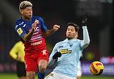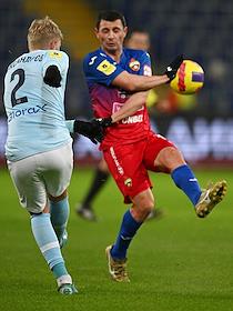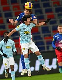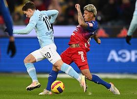 Российская Премьер-Лига (РПЛ). Тинькофф - Чемпионат России по футболу 2021/2022. 20-й тур. Матч между командами "ЦСКА" (Москва) - "Нижний-Новгород" (Нижний-Новгород) на стадионе "ВЭБ Арена". Игрок команды ЦСКА Алан Дзагоев (справа) и игрок команды "Нижний Новгород" Виктор Александров (слева) во время матча.