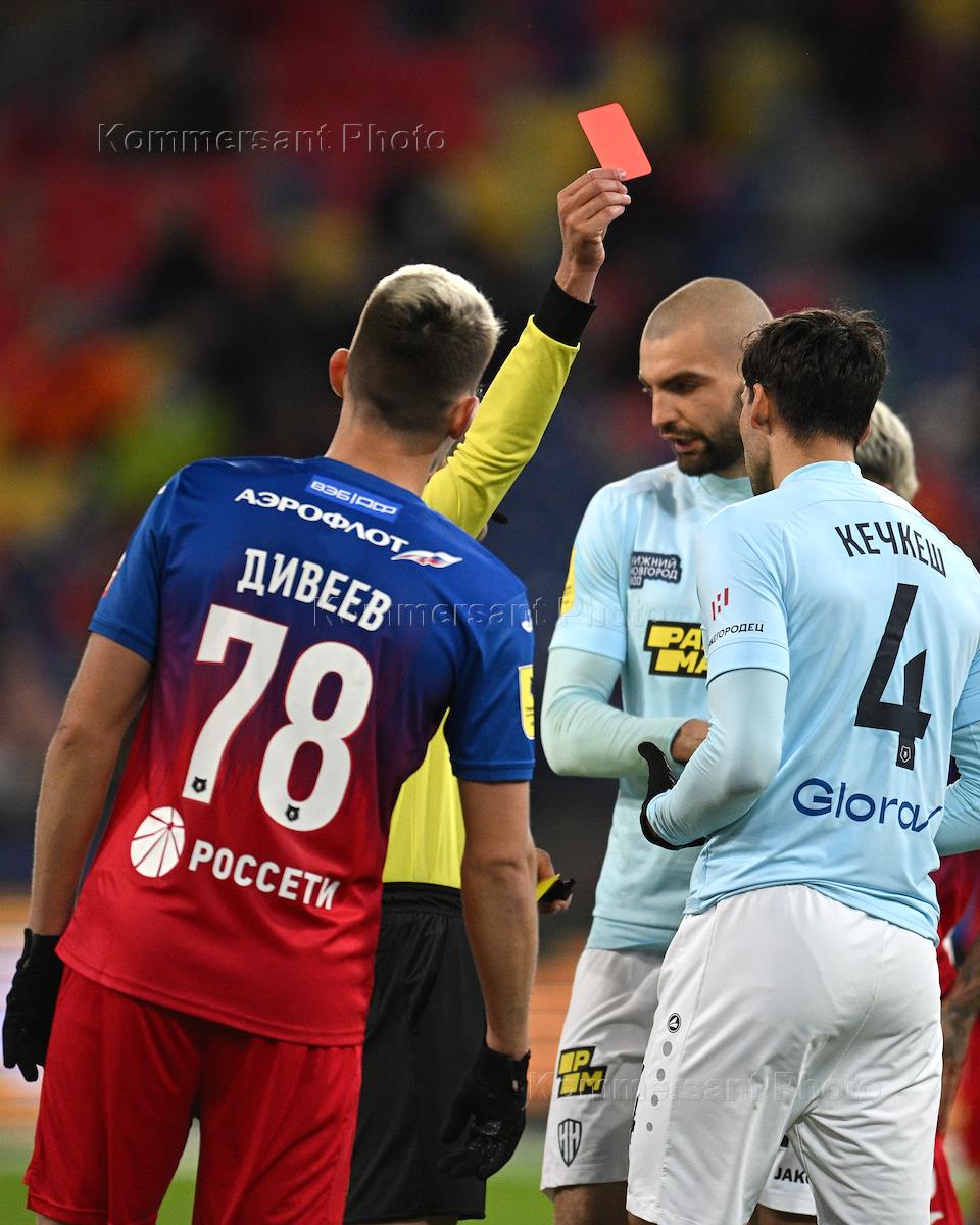 Российская Премьер-Лига (РПЛ). Тинькофф - Чемпионат России по футболу 2021/2022. 20-й тур. Матч между командами "ЦСКА" (Москва) - "Нижний-Новгород" (Нижний-Новгород) на стадионе "ВЭБ Арена". Игроки команды "Нижний Новгород" во время матча.