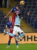 Российская Премьер-Лига (РПЛ). Тинькофф - Чемпионат России по футболу 2021/2022. 20-й тур. Матч между командами "ЦСКА" (Москва) - "Нижний-Новгород" (Нижний-Новгород) на стадионе "ВЭБ Арена". Игрок команды ЦСКА Марио Фернандес (в центре, вверху) и игрок команды "Нижний Новгород" Иброхимхалил Юлдошев (в центре) во время матча.