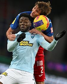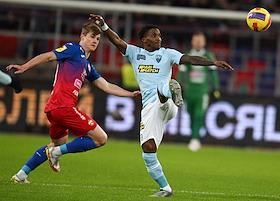 Российская Премьер-Лига (РПЛ). Тинькофф - Чемпионат России по футболу 2021/2022. 20-й тур. Матч между командами "ЦСКА" (Москва) - "Нижний-Новгород" (Нижний-Новгород) на стадионе "ВЭБ Арена". Игрок команды "Нижний Новгород" Ричи Эннин (слева) во время матча.