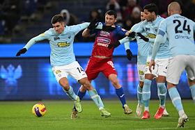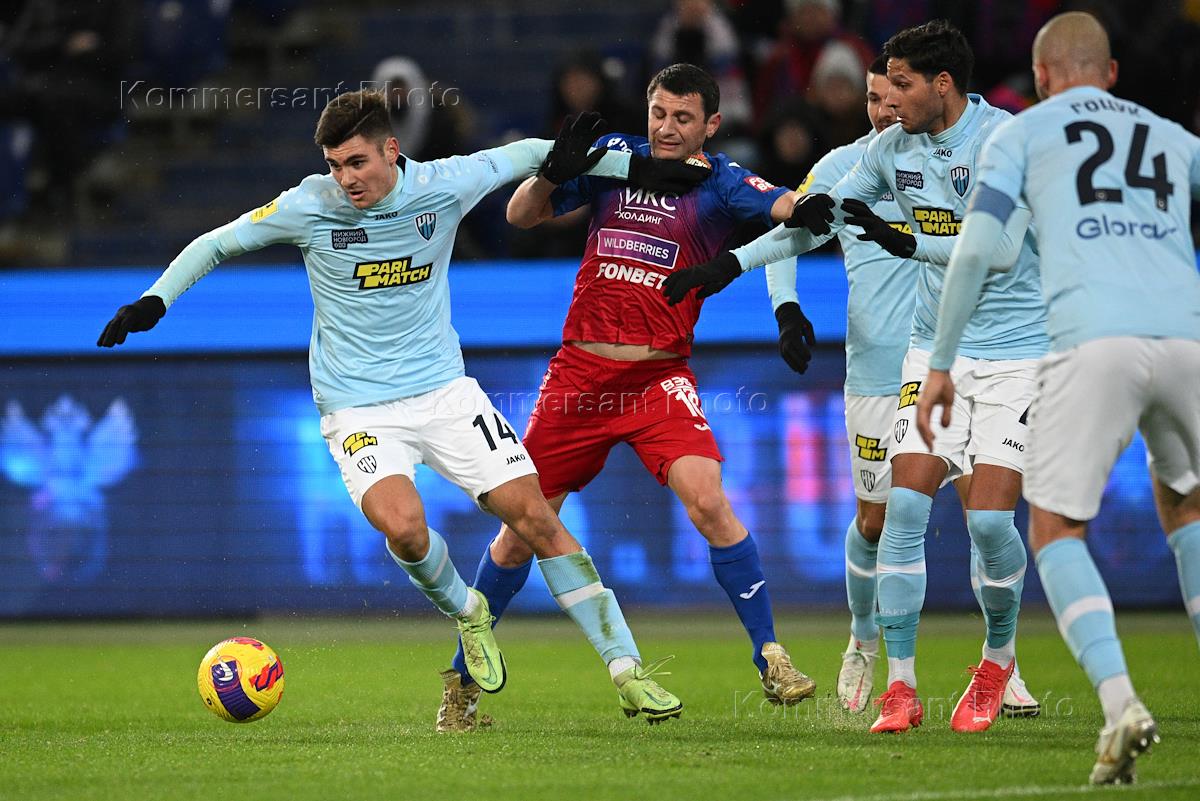 Российская Премьер-Лига (РПЛ). Тинькофф - Чемпионат России по футболу 2021/2022. 20-й тур. Матч между командами "ЦСКА" (Москва) - "Нижний-Новгород" (Нижний-Новгород) на стадионе "ВЭБ Арена". Игрок команды "Нижний Новгород" Кирилл Кравцов (слева) и игрок команды ЦСКА Алан Дзагоев (второй слева) во время матча.