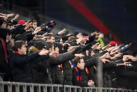 Российская Премьер-Лига (РПЛ). Тинькофф - Чемпионат России по футболу 2021/2022. 20-й тур. Матч между командами "ЦСКА" (Москва) - "Нижний-Новгород" (Нижний-Новгород) на стадионе "ВЭБ Арена". Зрители на зрительской трибуне во время матча.