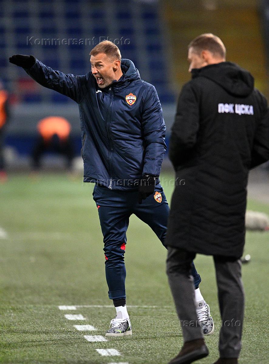Российская Премьер-Лига (РПЛ). Тинькофф - Чемпионат России по футболу 2021/2022. 20-й тур. Матч между командами "ЦСКА" (Москва) - "Нижний-Новгород" (Нижний-Новгород) на стадионе "ВЭБ Арена". Главный тренер команды ЦСКА Алексей Березуцкий (слева) во время матча.