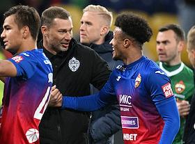 Российская Премьер-Лига (РПЛ). Тинькофф - Чемпионат России по футболу 2021/2022. 20-й тур. Матч между командами "ЦСКА" (Москва) - "Нижний-Новгород" (Нижний-Новгород) на стадионе "ВЭБ Арена". Главный тренер команды ЦСКА Алексей Березуцкий (второй слева) после окончания матча.