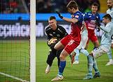 Российская Премьер-Лига (РПЛ). Тинькофф - Чемпионат России по футболу 2021/2022. 20-й тур. Матч между командами "ЦСКА" (Москва) - "Нижний-Новгород" (Нижний-Новгород) на стадионе "ВЭБ Арена". Вратарь команды "Нижний Новгород" Артур Нигматуллин (слева) и игрок команды ЦСКА Яка Бийол (второй слева) во время матча.