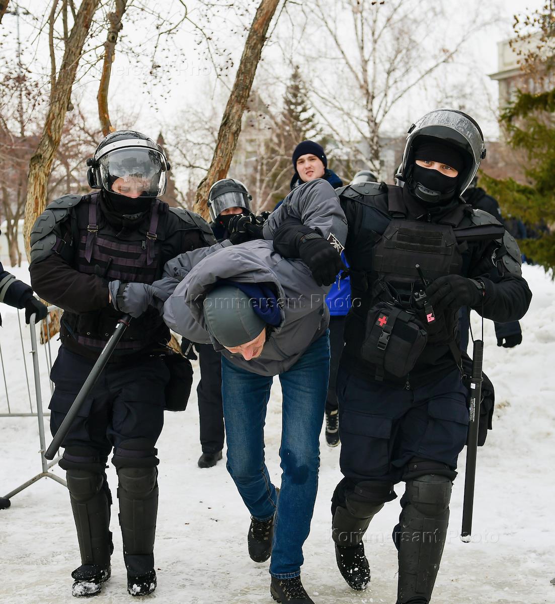Несогласованная акция протеста против специальной военной операции Вооруженных Сил России на Украине на площади Ленина. Сотрудники полиции во время задержания участников акции.