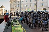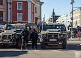 Несогласованная акция против специальной операции на Украине на Невском проспекте. Сотрудники полиции и специальная техника во время дежурства на места проведения акции.