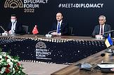 Рабочая поездка министра иностранных дел России Сергея Лаврова в Турцию. Турецко-российско-украинские переговоры в в Belek Regnum Carya Hotel. Министр иностранных дел министр иностранных дел Турции Мевлют Чавушоглу (в центре) во время переговоров.