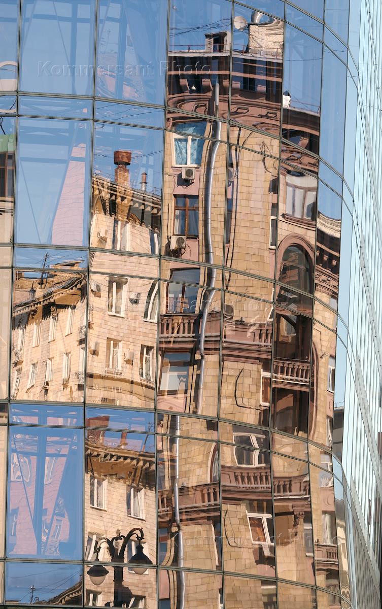 Жанровая фотография. Отражение домов в стеклянном фасаде здания.