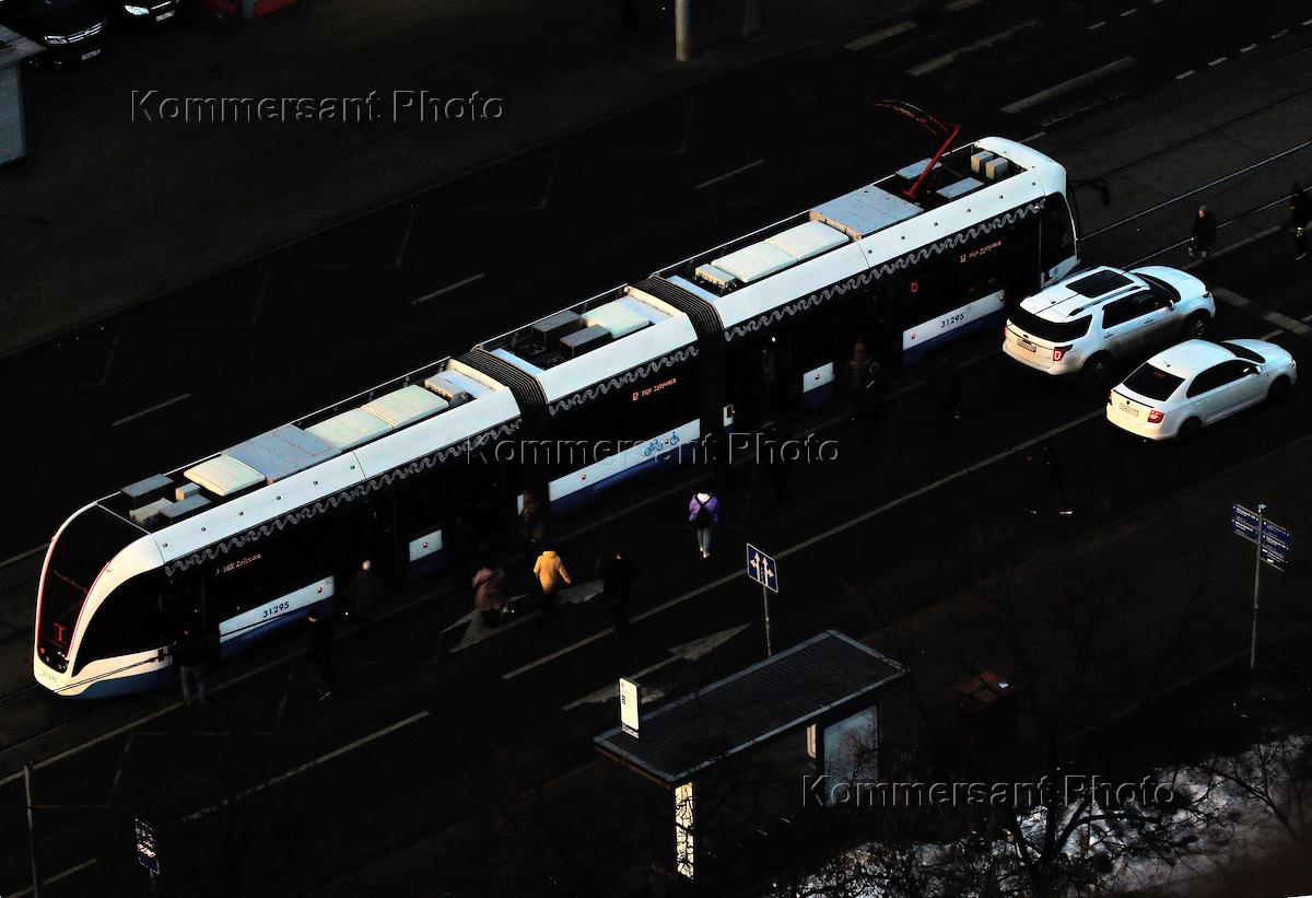 Виды Москвы. Жанровая фотография. Трамвай и автомобили на дороге.