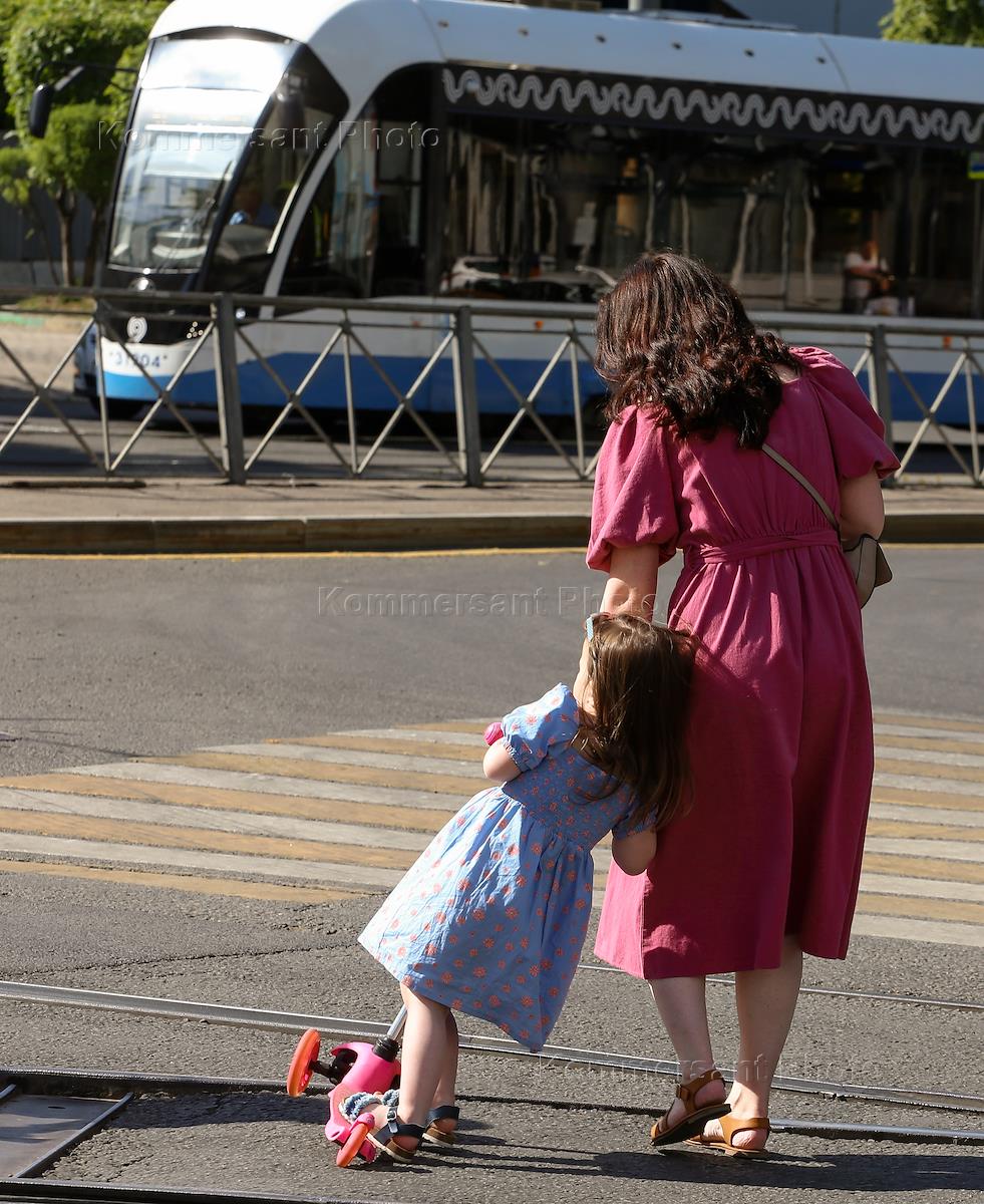 Жанровая фотография. Женщина с ребенком на самокате переходит улицу.