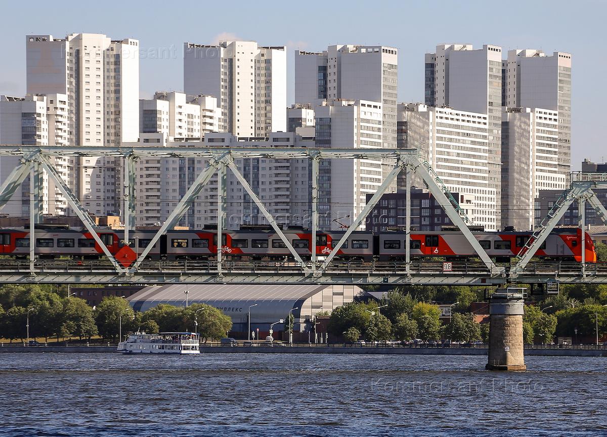 Виды Москвы. Жанровая фотография. Электропоезд "Ласточка" Московского центрального кольца (МЦК) во время движения по мосту через реку.