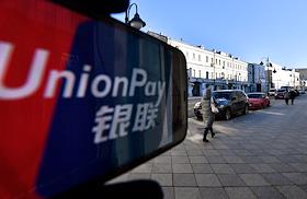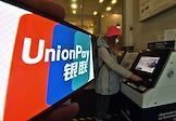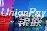Genre photography. The emblem of the UnionPay payment system and the reflection of the Kremlin in the glass.