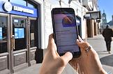Genre photography. The emblem of the UnionPay payment system in a mobile phone. Gazprombank office building.