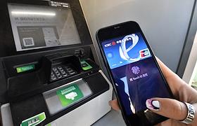 Genre photography. The emblem of the payment system UnionPay on the screen of a mobile phone. The girl withdraws money from an ATM.