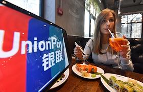 Genre photography. The emblem of the payment system UnionPay on the screen of a mobile phone. The girl eats sushi and rolls in a Japanese restaurant.