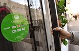 Genre photography. Stickers of emblems of Visa, MasterCart, UnionPay payment systems on the front door of Sberbank.