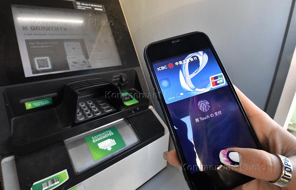 Жанровая фотография. Эмблема платежной системы UnionPay на экране мобильного телефона. Банкомат Сбербанка.