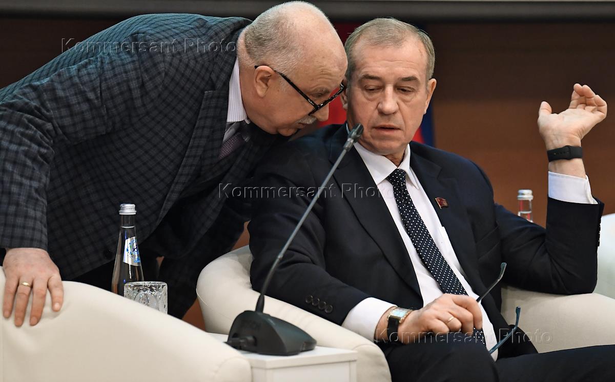 Parliamentary hearings of the faction of the Communist Party of the Russian Federation on the topic: "On topical issues of the development of the fuel and energy complex of Russia" in the Small Hall of the State Duma of Russia. First Deputy Chairman of the Russian State Duma Committee on Energy Sergei Levchenko (left) and First Deputy Chairman of the Russian State Duma Committee on Security and Anti-Corruption Yuri Afonin (right) during hearings.