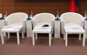 Parliamentary hearings of the faction of the Communist Party of the Russian Federation on the topic: "About topical issues of the development of the fuel and energy complex of Russia" in the Small Hall of the State Duma of Russia. Genre photography. Empty chairs of deputies before the start of the hearings.